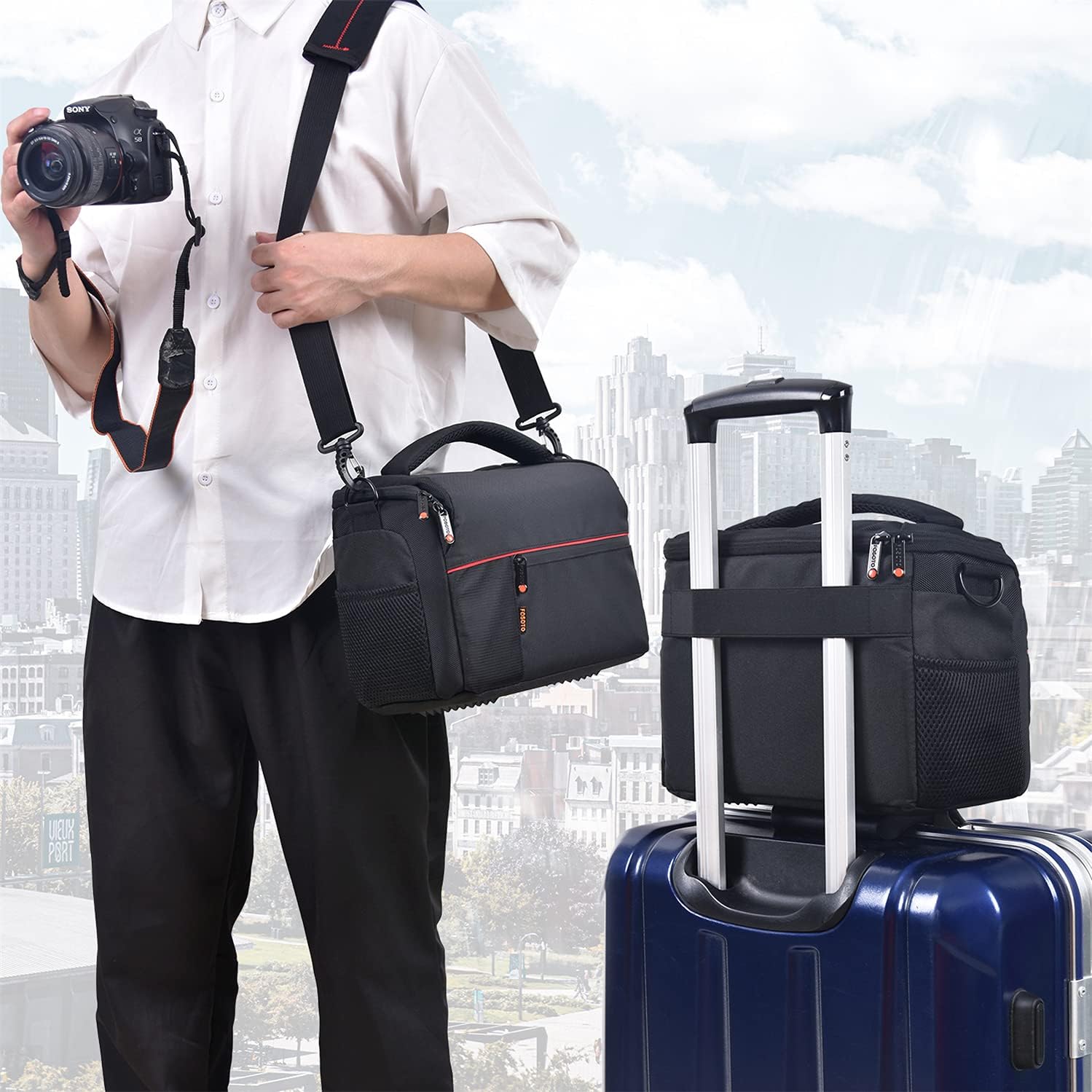 - 【Nutzung auf Reisen】 Das feste elastische Band im Kofferraum hinter der Kameratasche erleichtert das Tragen.